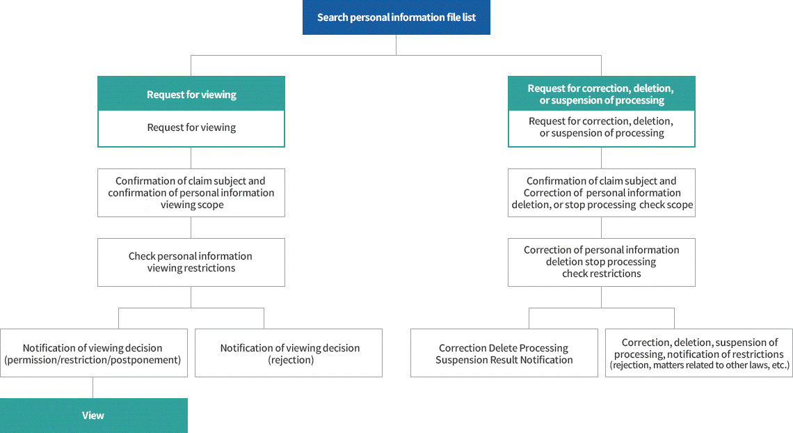 - 1) Requests for viewing, correction, deletion, and suspension of processing of personal information are processed through the procedures below.