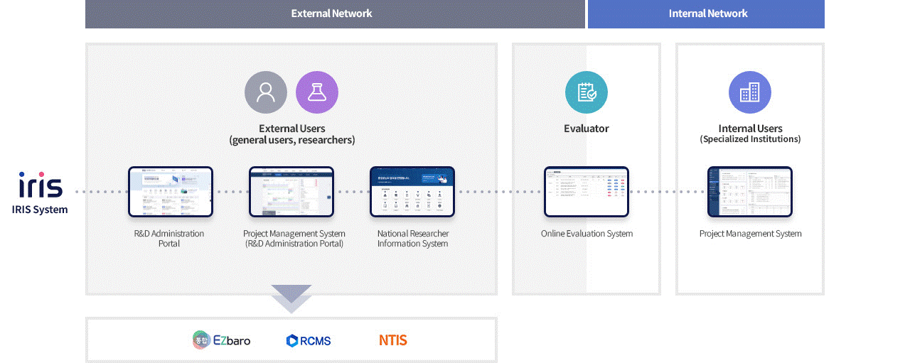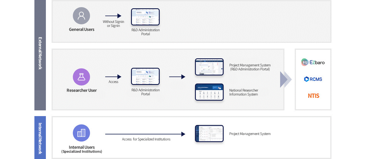 - R&D지원포털 - External network [External users (general users, researchers)] → Ezbaro, RCMS, NTIS 관련사이트로 연결